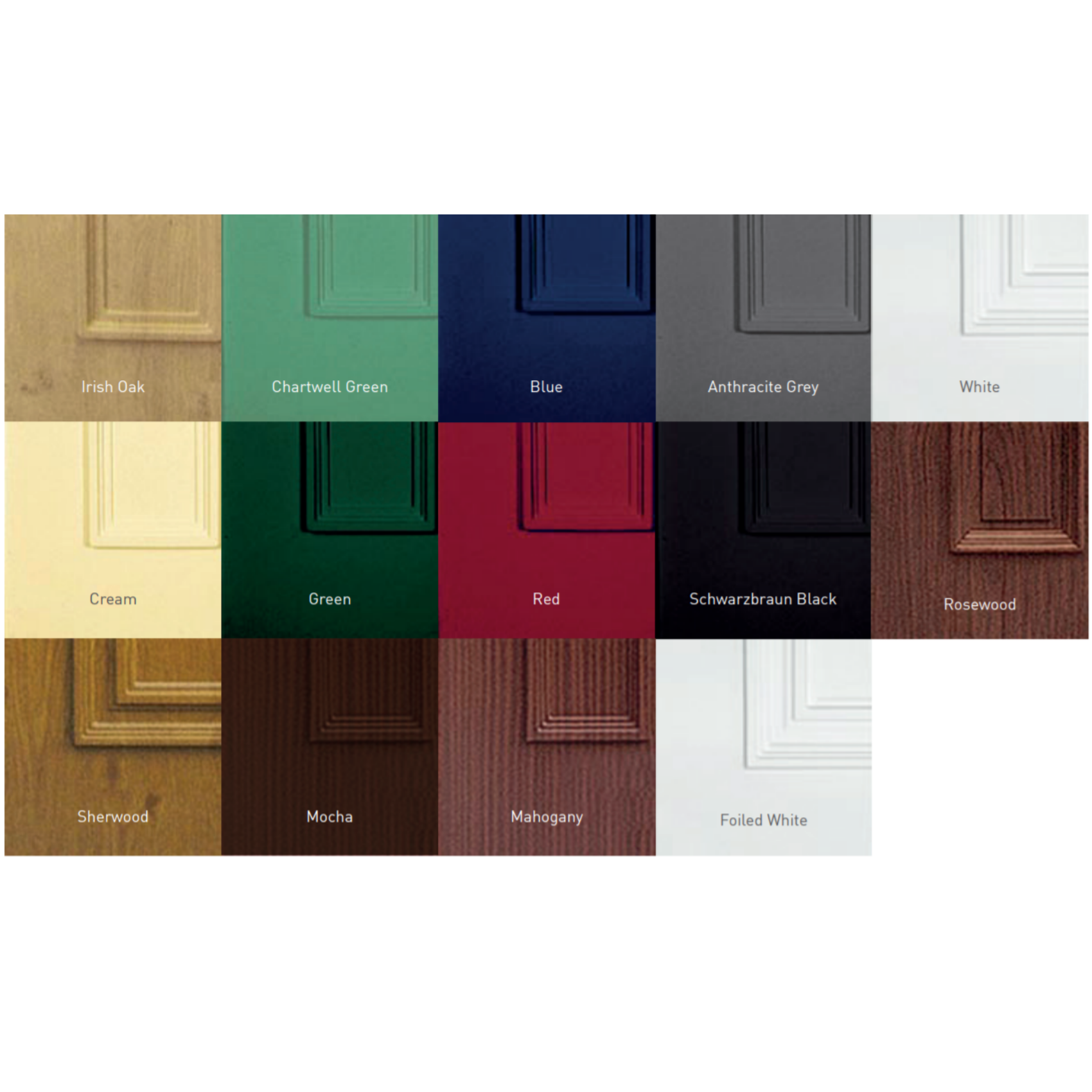 Your customer wants choice, and we give that in this extended colour range, which is capable of matching any coloured door frame. The grain runs vertically on door and side panels, and horizontally on conservatory panels.